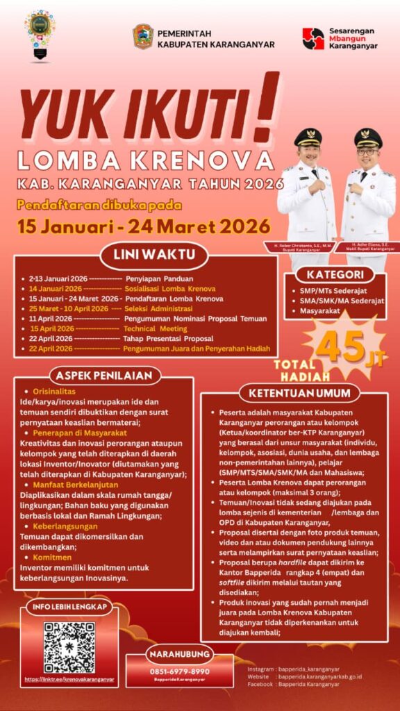 Bagi seluruh masyarakat Kabupaten Karanganyar, yuk ikuti Lomba Kreasi dan Inovasi (KRENOVA) tingkat Kabupaten Karanganyar tahun 2026!